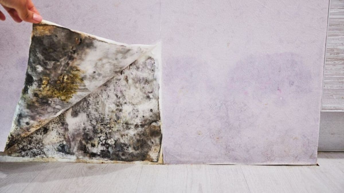 De eerste tekenen van schimmelvorming uiten zich in donkere, natte plekken op de muur. De schimmel tast het onderliggende materiaal aan, waardoor behang en pleisterwerk kunnen loskomen.